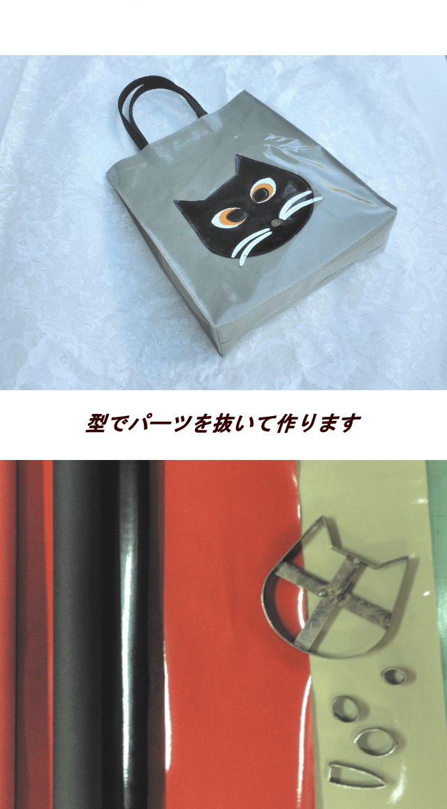 猫はエナメルのフェイクレザーをスウェーデン鋼で型抜きし張り合わせ縫い付けてあり手作り感満載です。